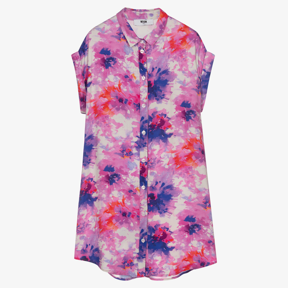 Pretty pink shirt dress for teen girls by MSGM, made in silky and lightweight viscose. Patterned with a pink, purple and blue tie-dye design, it has turned-up sleeves, a stylish curved hem, and a tie-waist for a lovely silhouette.