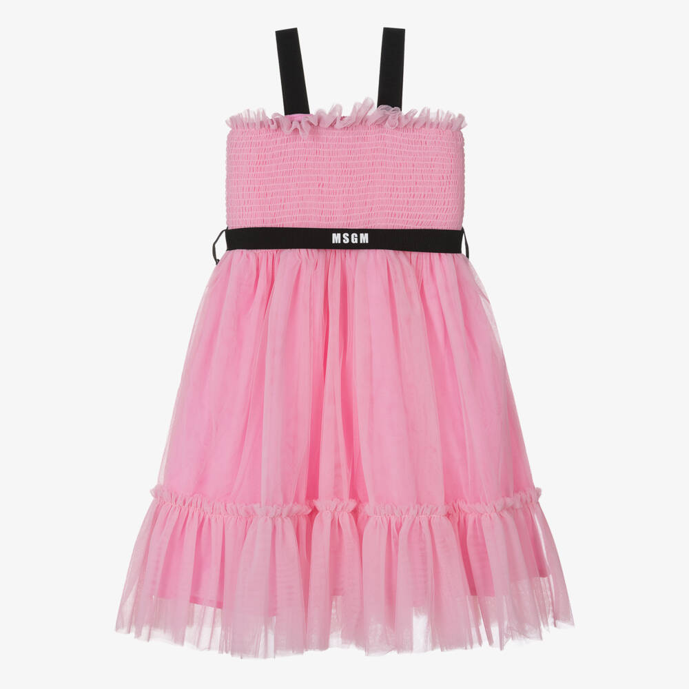 A pink dress for teen girls by Italian brand MSGM, made with a double layer of lightweight tulle in pale pink over a fuchsia pink voile lining. It has a small frill on the edge of the shirred bodice and a pretty ruffle at the skirt hem. Printed with a white micro logo, the black, detachable belt is made from stretchy grosgrain ribbon to match the straps, subtly contrasting against the femininity of the dress. The dress fastens with a concealed side zip for a neat finish.