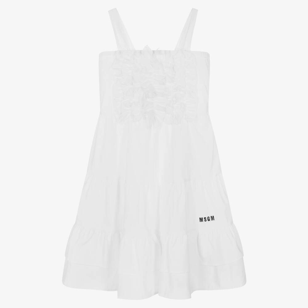 Gorgeous white sundress for teen girls by MSGM, with a ruffled bodice and adjustable shoulder straps. Made in cool and comfortable cotton poplin, this feminine style has a black embroidered logo on the full, tiered skirt. For a neat finish, the dress has a concealed zip fastening on the side, with a branded silver pull.