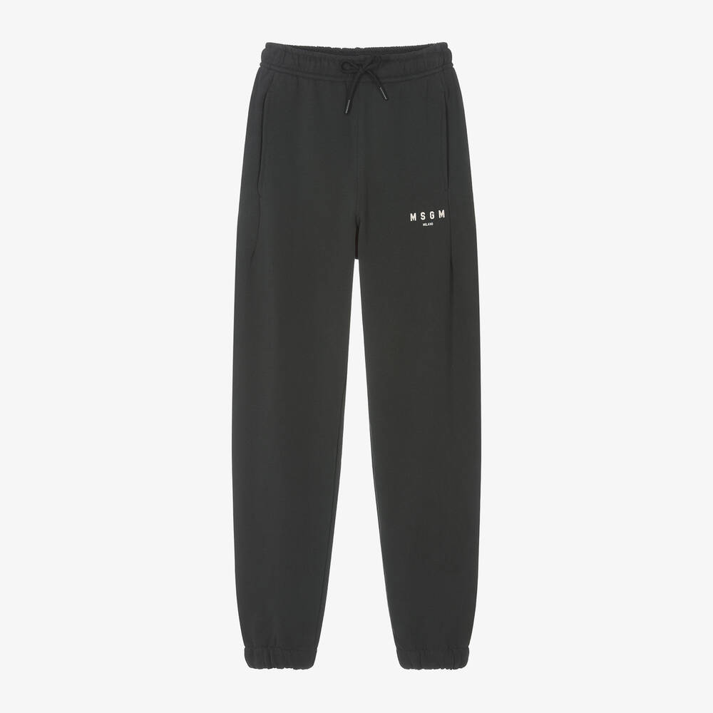 Washed black joggers for boys and girls by MSGM. They are made from soft mid-weight cotton jersey with an ivory logo printed on one side and a branded tab stitched on the back. Complete with discreet pockets, they have stretchy cuffs, and a comfortable elasticated drawstring waist.