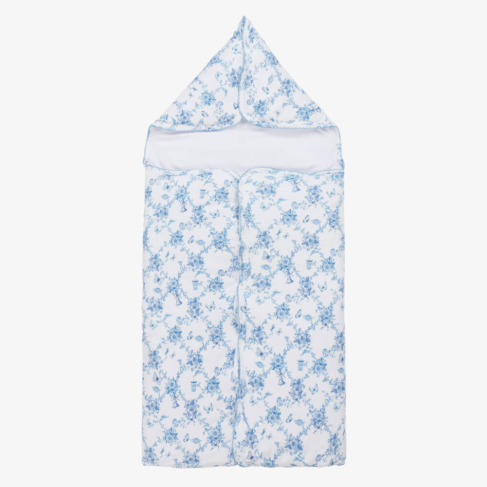 Beautiful white nest for baby girls from My Little Pie, with a blue Toile du Jouy floral pattern. Made in super soft organic Supima cotton jersey and padded for warmth, it has delicate blue picot trim. Snug and cosy, it fastens easily with poppers on the front, along the sides and on the hood, allowing it to be opened and laid flat.