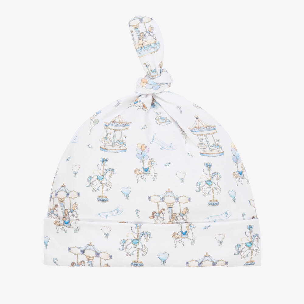 Exclusive to Childrensalon, this adorable white and blue carousel print hat for baby girls is by My Little Pie. Soft and gentle against delicate skin, it is made in organic Supima cotton jersey. It has a sweet turned up brim and a cute top knot.