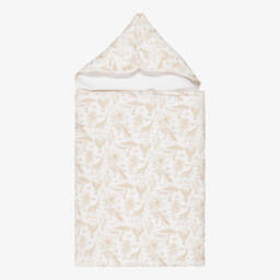 This lovely white and beige nest for baby boys and girls by My Little Pie, features a delightful African safari-inspired Toile de Jouy print. Gently padded for warmth and comfort, it is made in soft Supima cotton jersey and trimmed with delicate picot embroidery. It fastens easily with poppers along the sides and on the hood, allowing it to be opened and laid flat.