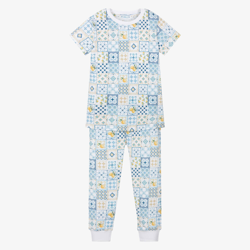 Beautifully soft and comfortable white pyjamas for boys and girls by My Little Pie, with a blue and yellow tile pattern. Ideal for a good night's sleep, they are made in organic Supima cotton jersey and the trousers have a stretchy waistband for a gentle fit.