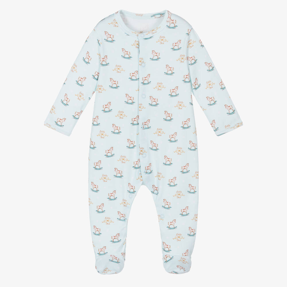 Pale blue with white dots, this sweet babygrow for boys and girls by My Little Pie. It is patterned in a delightful print of rocking horses and the words 'Little One'. Comfortable against delicate skin, it is made in super soft organic Supima cotton jersey. There are easy-fastening poppers down the front and between the legs to help with dressing.