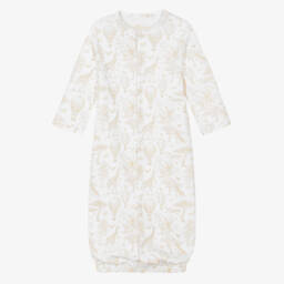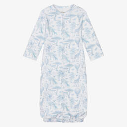 Patterned with a charming pale blue Toile de Jouy design with African animals and hot air balloons, an ivory converter gown for baby boys and girls by My Little Pie. Made in super soft, organic Supima cotton, this versatile style can be easily transformed from a babysuit to a gown with the fastening of a few poppers. There are useful, integrated scratch mitts on smaller sizes.