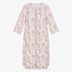 Patterned with a charming pale blue toile de Juoy design with African animals and hot air balloons, an ivory converter gown for baby boys and girls by My Little Pie. Made in super soft, organic Supima cotton, this versatile style can be easily transformed from a babysuit to a gown with the fastening of a few poppers. There are useful, integrated scratch mitts on smaller sizes.