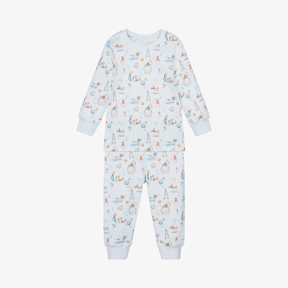 Pale blue pyjamas for boys by My Little Pie, made from super soft, organic Supima cotton jersey. A charming Little Prince-themed pattern can be seen on both pieces. Ideal for a comfortable night's sleep, the short-sleeved top has a lightly ribbed crew neck, whilst the cuffed trousers have a gently elasticated waistband.