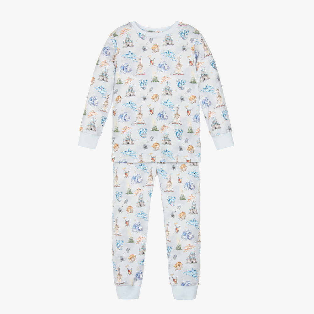 Super soft grey-blue pyjamas for boys by My Little Pie, made in organic Supima cotton. Cosy against delicate skin, these long-length pyjamas are printed with castles and dragons to sparkle your little one's imagination at bedtime.
