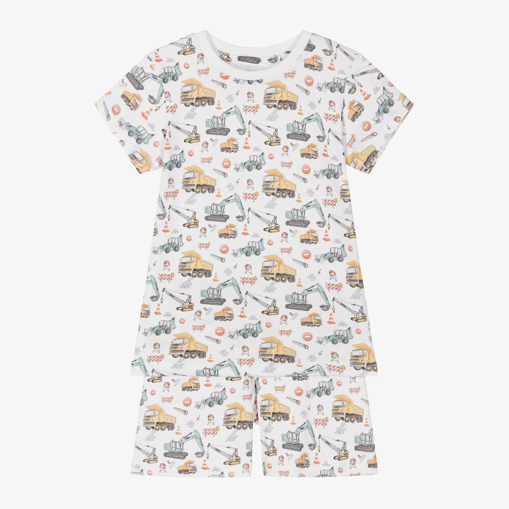 White short pyjamas for boys by My Little Pie, made in soft and comfortable organic Supima cotton jersey. Patterned in a fun construction equipment print in yellow, blue and grey, the top has a ribbed neckline and the shorts have a gently elasticated waist.