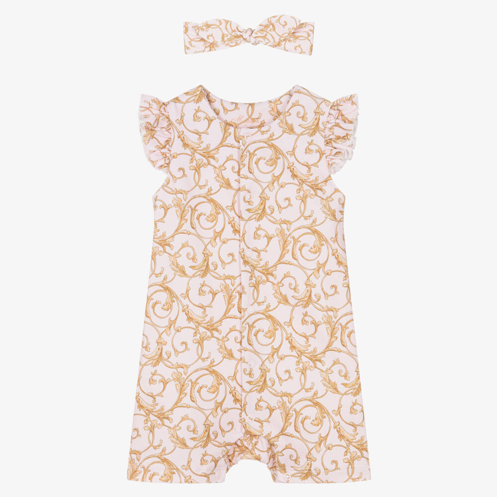 Patterned in an elegant gold baroque print, this pale pink babysuit set for girls is by My Little Pie. Beautifully soft and comfortable, it is made in organic Supima cotton jersey. The shortie has pretty ruffles over the shoulder and fastens easily with poppers. A matching bow headband, elasticated at the back for an ideal fit, completes the adorable outfit.