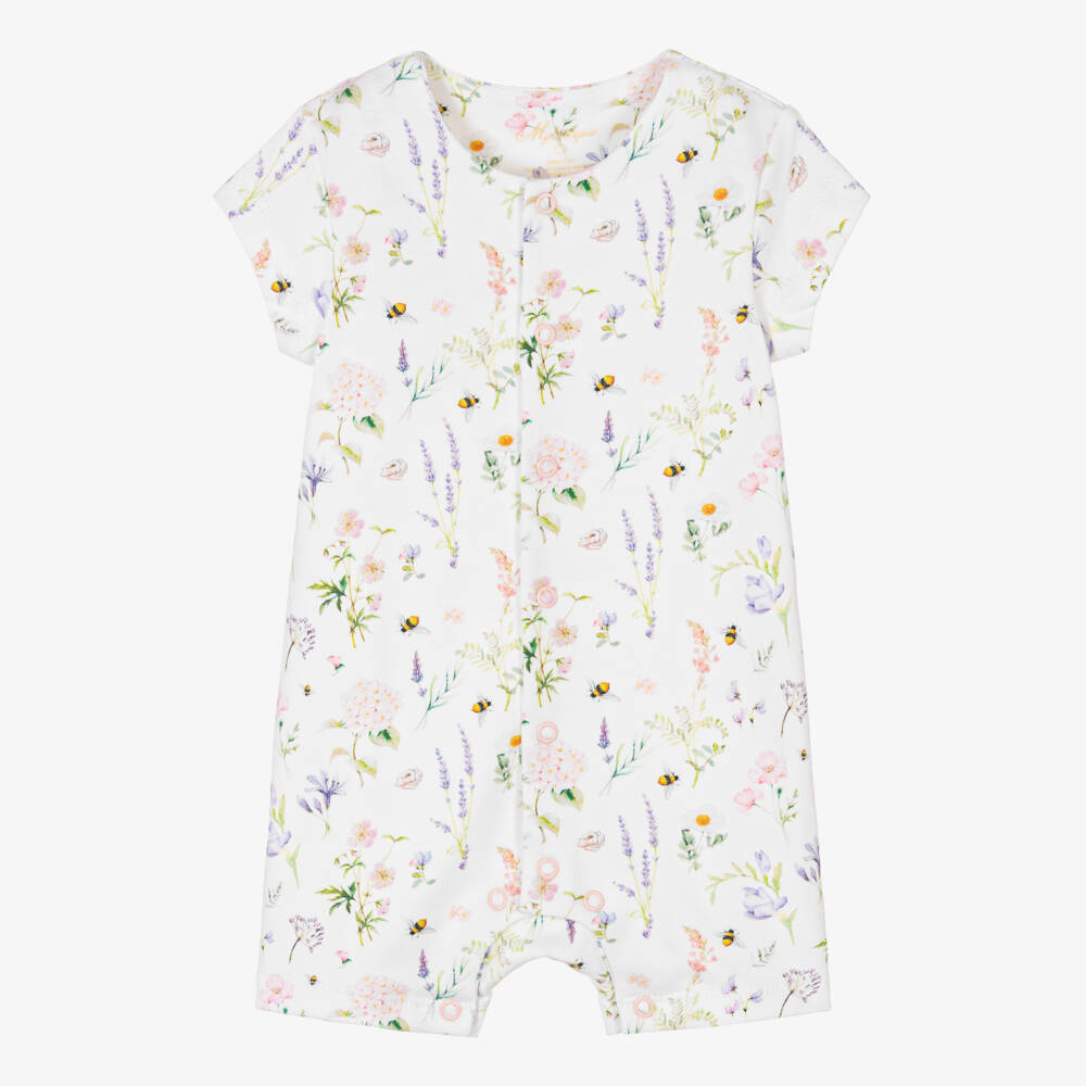 Ivory shortie for baby girls by My Little Pie, made in super soft organic Supima cotton. Beautifully soft against the skin, it is both comfortable and durable with a pretty pink and lilac floral print and little bees. Poppers on the front and between the legs help with quick and easy changing.