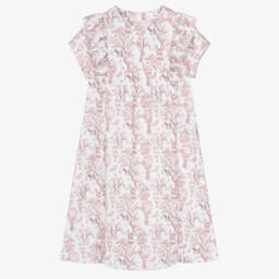 Printed with elegant young ladies and traditional afternoon teas, this lovely pink night dress for girls is by My Little Pie. Beautifully soft and comfortable, it is made in organic Supima cotton jersey, with a pretty ruffled hemline. It fastens easily with a single popper on the back.
