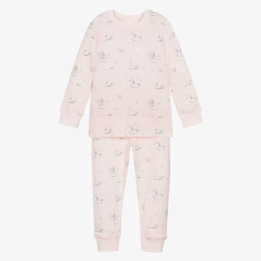 Beautiful pink pyjamas for younger girls by My Little Pie, made in soft and strong organic Supima cotton for ultimate comfort. These lovely pyjamas are patterned with swans and cygnets in grey and white and have stretchy ribbed trims for a comfortable fit.