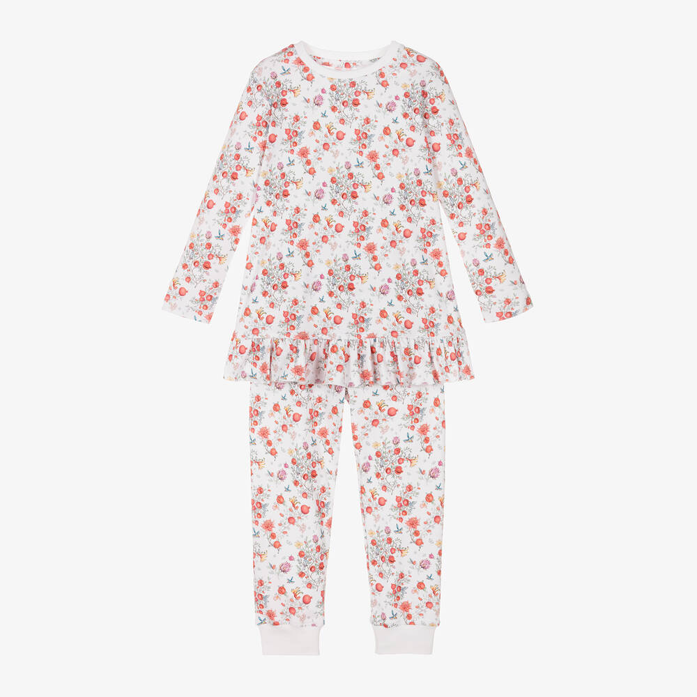 Pretty ivory pyjamas for girls by My Little Pie with a red and green pomegranate print. They are made in beautifully soft organic Supima cotton jersey for a comfortable night's sleep. The top has a lovely ruffled hem and the cuffed trousers have a gently elasticated waistband.