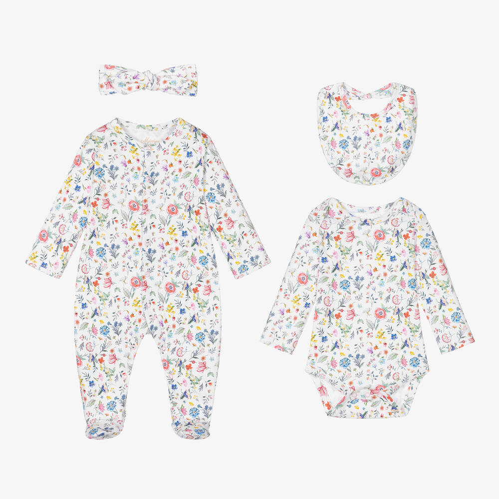 Exclusive to Childrensalon, lovely white babygrow set for baby girls, by My Little Pie. Made from organic Supima cotton jersey, all the pieces have a matching pretty pink and blue floral print. This adorable set comes with a bodyvest, a bib, and a gorgeous headband with a fixed bow.