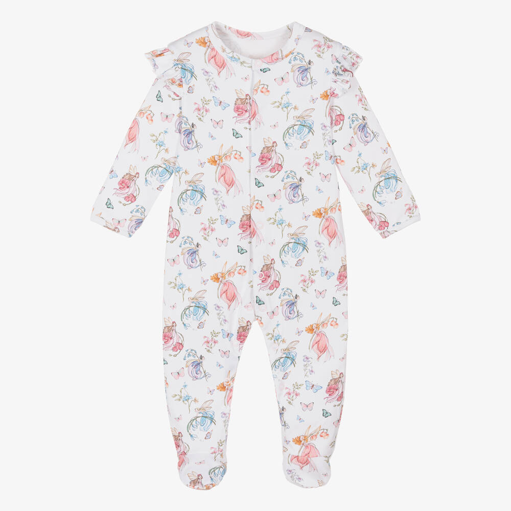 White babygrow for girls by My Little Pie, with a delightful print of flower fairies in pink and blue. Comfortable against delicate skin, it is made in super soft organic Supima cotton jersey. There are pretty frills over the shoulders, with easy-fastening poppers down the front and between the legs.