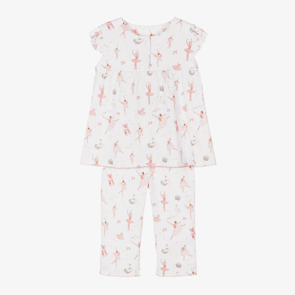 Patterned in a charming ballerina and swan print, these white and pink long pyjamas for girls are by My Little Pie. They are made in comfortable organic Supima cotton jersey, with picot embroidery trims. The sleeveless top has pretty frills over the shoulders and front poppers for easy fastening. The matching trousers have a gently elasticated waist.