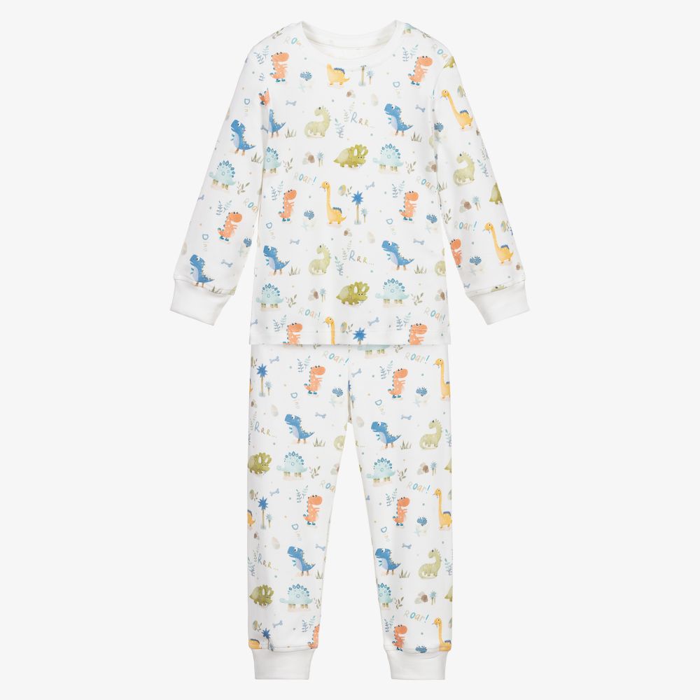 Exclusive to Childrensalon, ivory long pyjamas for boys by My Little Pie, made in super soft and stretchy organic Supima cotton jersey. They have a fun, colourful dinosaur print and ribbed trims.