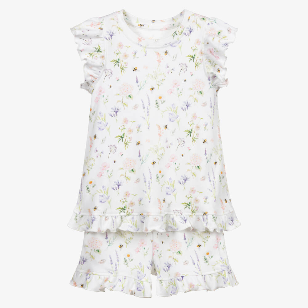 Exclusive to Childrensalon, ivory short pyjamas for girls by My Little Pie, made in super soft and stretchy organic Supima cotton jersey. They have a pretty floral and bee print and ruffle trims.