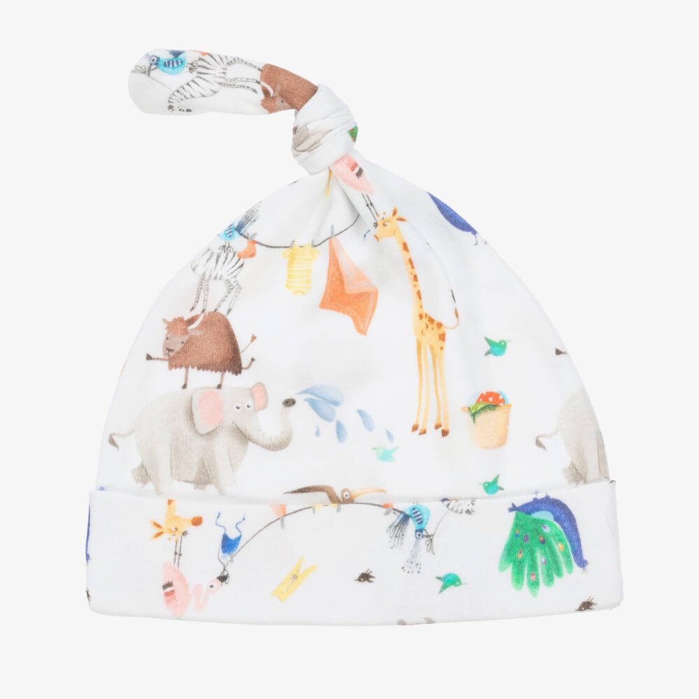 Sweet ivory hat for baby boys and girls by My Little Pie, with a colourful animal laundry print. It is made in super soft, organic Supima cotton jersey, with a turned-up brim and cute top knot.