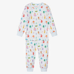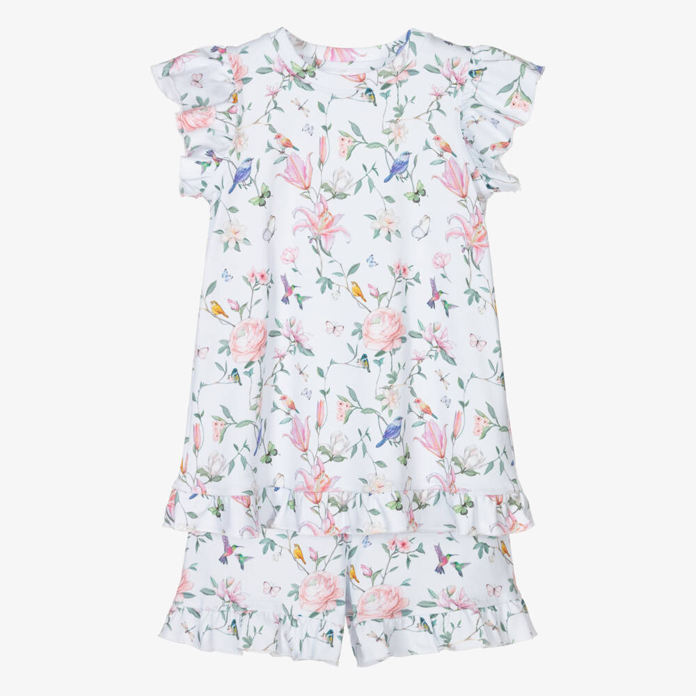 Exclusive to Childrensalon, pretty light blue pyjamas for girls by My Little Pie. Made from organic Supima cotton jersey, they have a lovely pink floral print all-over, and ruffle trims on the cuffs.