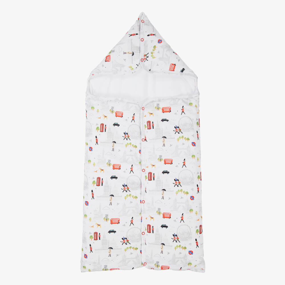 Exclusive to Childrensalon, a white baby nest for boys and girls by My Little Pie, made in super soft and stretchy organic Supima cotton jersey. Lightly padded, it has a colourful London landmarks print and popper fastenings on the front and bottom. There are poppers on the hood, which can be opened and laid flat.