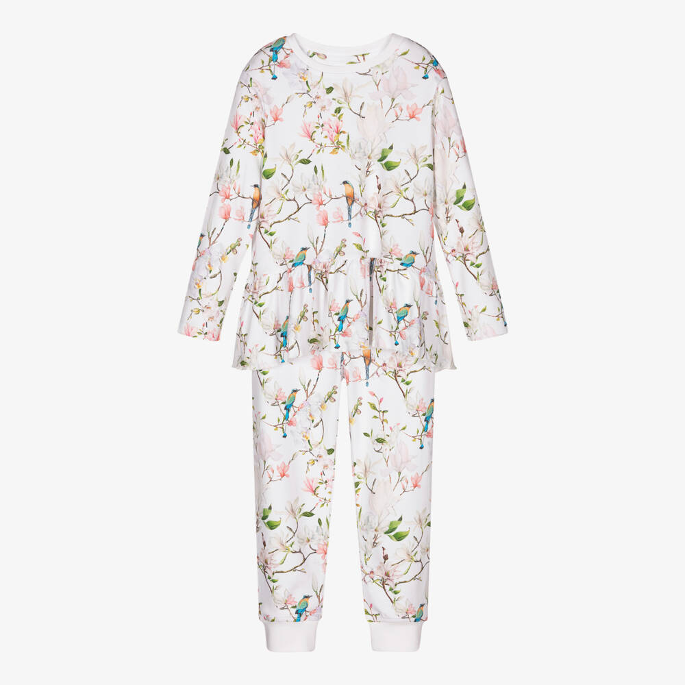 Exclusive to Childrensalon, white pyjamas for girls by My Little Pie. They have a beautiful magnolia and bird print in ivory, pink and blue, and a pretty frilled hem on the top. Wonderfully soft against the skin, they are made in organic Supima cotton jersey, which is both strong and durable. The care details are printed, so there are no scratchy labels.