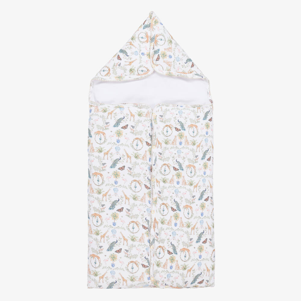 Beautiful white nest for baby boys and girls from My Little Pie, with a colourful animal and floral design. It is made in super soft organic Supima cotton jersey and lightly padded, with delicate beige picot trim. Snug and cosy, it fastens easily with poppers on the front, along the sides and on the hood, allowing it to be opened and laid flat.