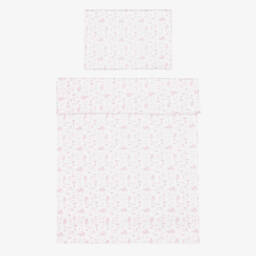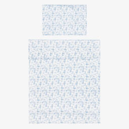 White and blue bedding set for baby boys by My Little Pie, featuring a classic Toile de Juoy print with a sweet Cupid design. Made in super soft organic Supima cotton jersey, the set includes a pillowcase and a duvet cover, both with popper fastenings. Ideal for adding a touch of elegance to the nursery or your little one's bedroom, it comes with a matching drawstring bag for easy storage.