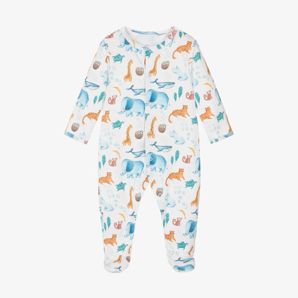 Adorable white babygrow for boys and girls from Ukrainian brand, My Little Pie. Made in super soft organic Supima cotton, it is cosy against delicate skin and the colourful animal print gives a sweet finish.