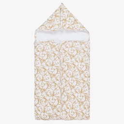 A white nest for baby boys and girls by My Little Pie, made in super soft Supima cotton jersey. With mid-weight padding for comfort and warmth, it is patterned with a gold Baroque-style print. It has easy-to-use popper fastenings on the front, hood and along the bottom to be opened and laid flat.