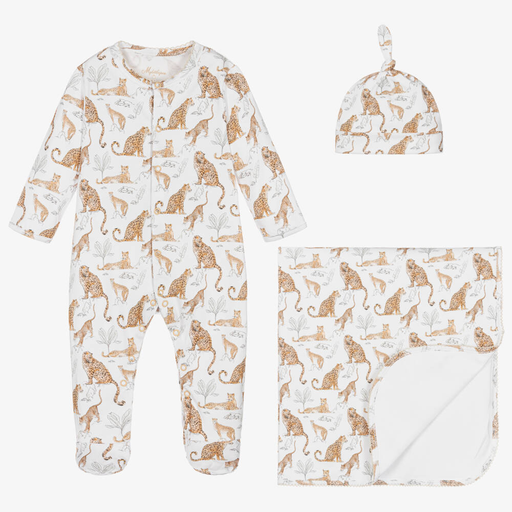 White jersey babygrow set for boys and girls by Ukrainian brand My Little Pie. Made in super soft, organic Supima cotton, which is beautifully soft on babies skin, it has a brown Bagheera print of sketches of leopards and leaves. The babygrow has a sweet beige picot trim around the neckline and fastens easily with poppers on the front and between the legs. A matching lined hat with a top knot and turned-up brim, along with a coordinating, picot-trimmed blanket complete the set.