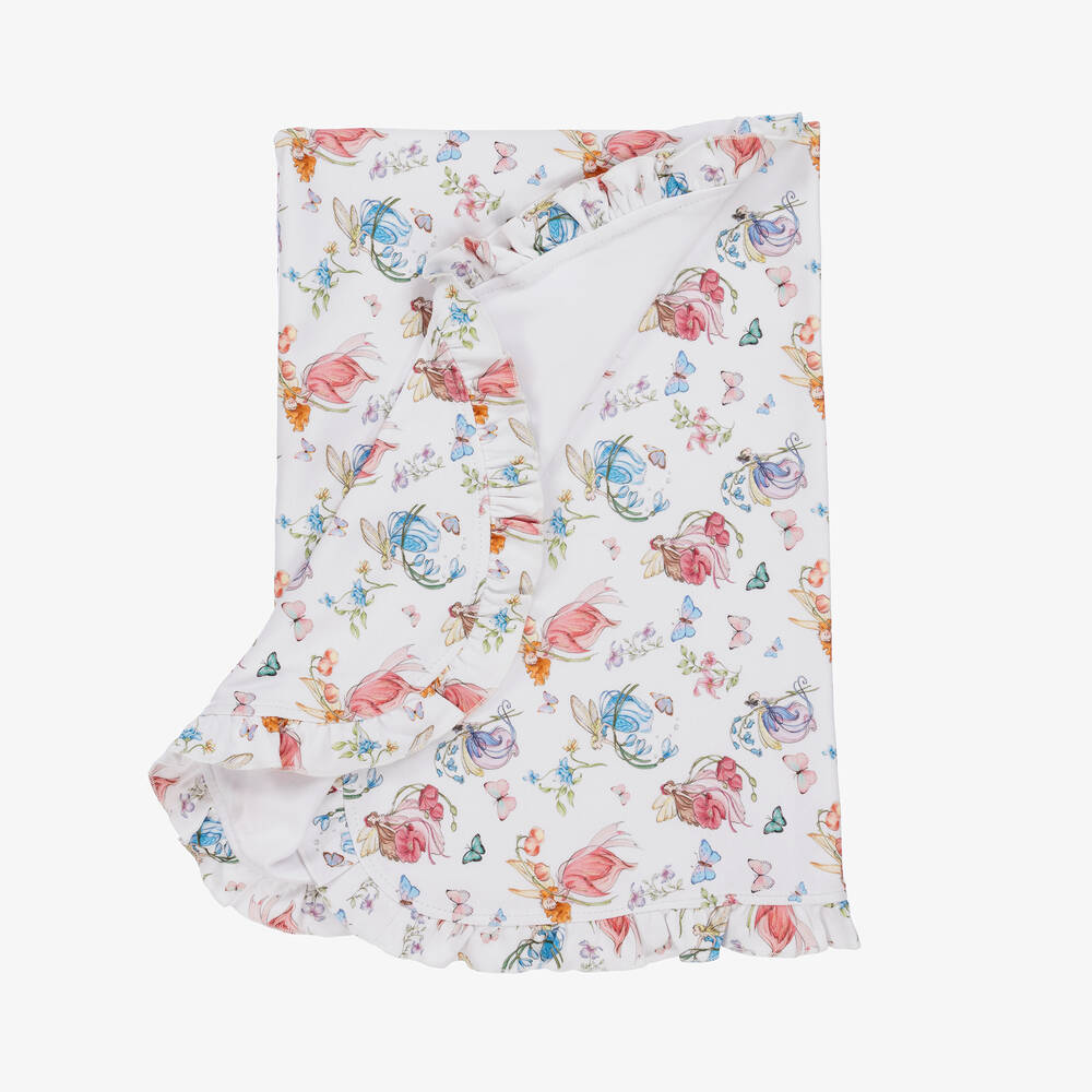 Patterned in a delightful flower fairy print in blue and pink, this white blanket for baby girls is by My Little Pie. It is made in a double layer of super soft organic Supima cotton jersey, with a pretty ruffle trim. Ideal for use in the car seat or stroller, it also makes an attractive nursery accessory.