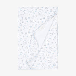 White jersey blanket for baby boys by My Little Pie, made in soft organic Supima cotton. Making a lovely addition to the nursery, it has a sweet blue and grey design featuring nursery toys, teddy bears, keys and bows. It has a delicate blue picot trim all around for added charm.