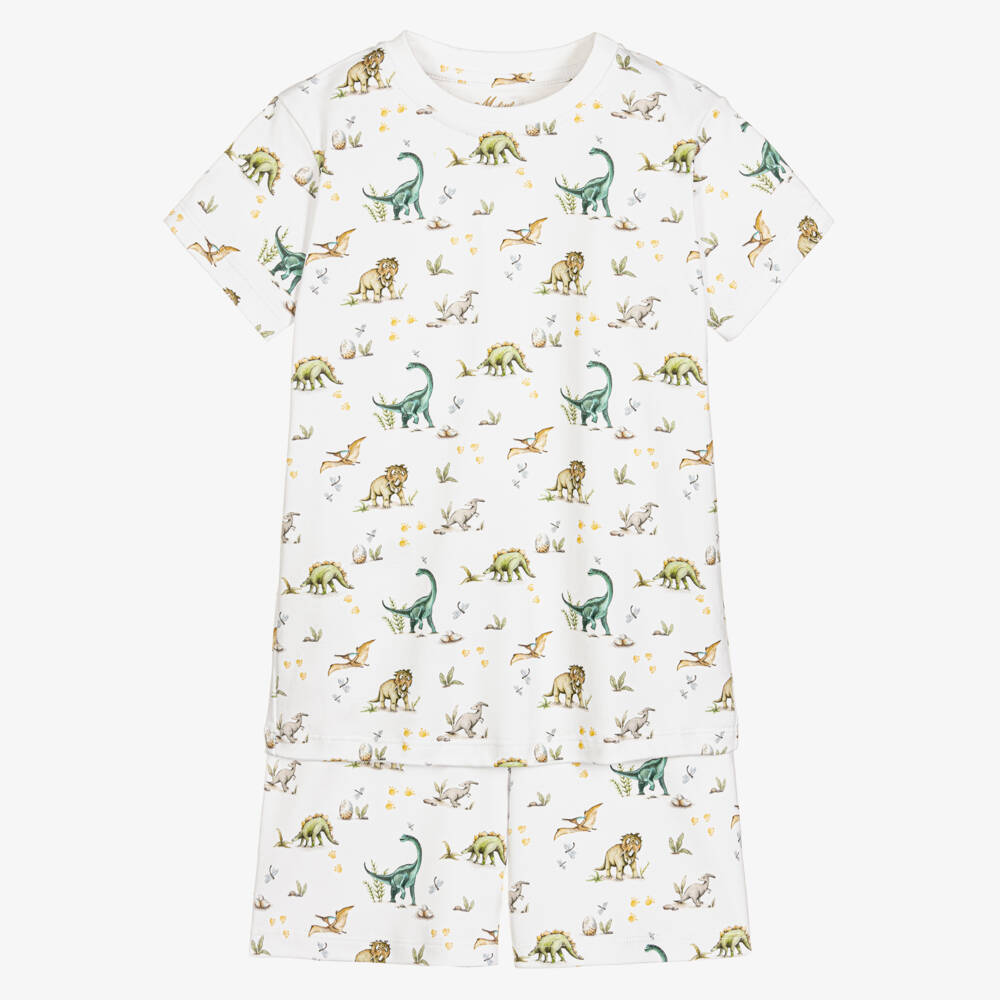 White pyjamas for boys by My Little Pie, beautifully patterned with dinosaurs in a green and beige colour palette. Super soft and gentle to the skin, they are made from organic Supima cotton jersey for ultimate comfort. The top has a ribbed crew neck and the shorts are gently elasticated around the waist.
