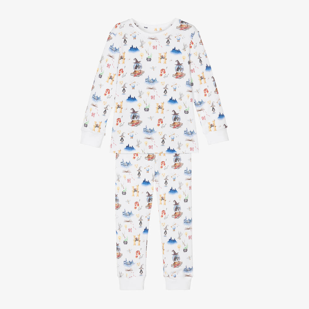 White long pyjamas for boys and girls by My Little Pie, patterned in a fun and colourful Harry Potter print. Soft and comfortable, they are made in organic Supima cotton jersey. They have stretchy ribbed trims and the trousers have a gently elasticated waist.