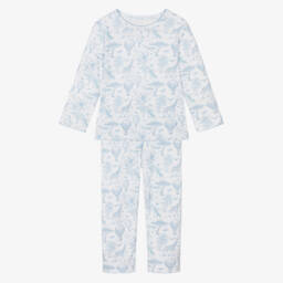 White long pyjamas for boys and girls by My Little Pie, patterned in a fun and colourful Harry Potter print. Soft and comfortable, they are made in organic Supima cotton jersey. They have stretchy ribbed trims and the trousers have a gently elasticated waist.