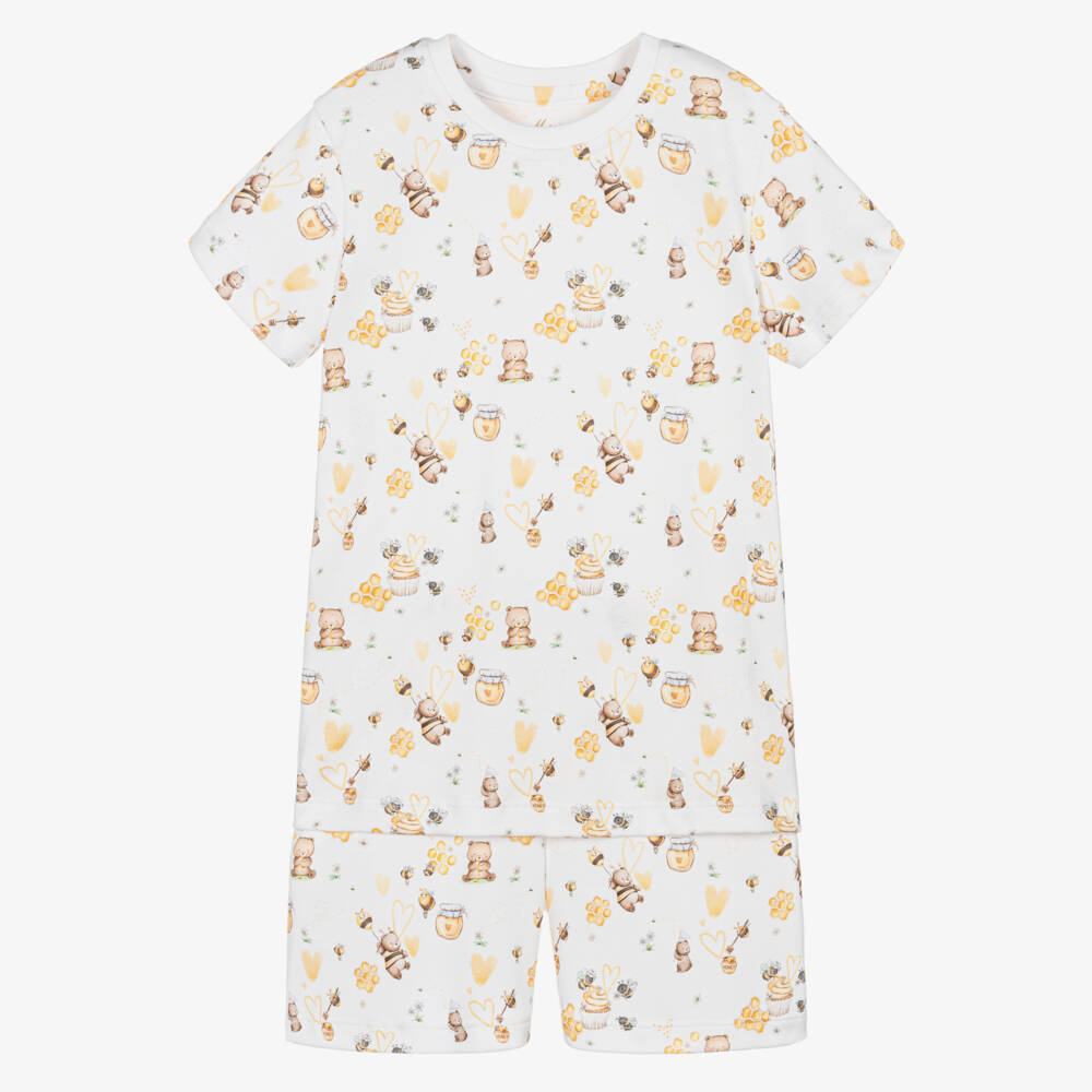 Boys and girls white pyjamas by My Little Pie, made in soft, organic Supima cotton jersey. They have an adorable yellow and beige Honey print of bears, bees, hearts and honey pots. The shorts have an elasticated waist for bedtime comfort.