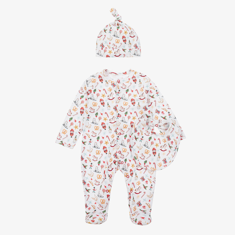 White babysuit set for boys and girls by My Little Pie, made in the softest organic supima cotton jersey. Gentle against delicate skin, the babygrow is patterned with a sweet festive-themed print featuring holly, snowmen, nutcrackers, toys and candy canes. It fastens with poppers on the front and between the legs and smaller sizes have fold-over scratch mitts. The matching hat has a turned-up brim and a cute top knot. A popper-fastening bib completes this lovely set.