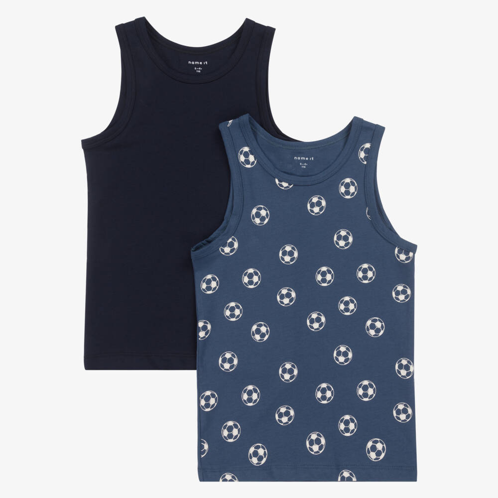 Pack of two vests for boys by Danish brand NAME IT, made in soft and stretchy cotton jersey. One comes in a plain navy blue shade and the other has a cool print that young football fans will love.