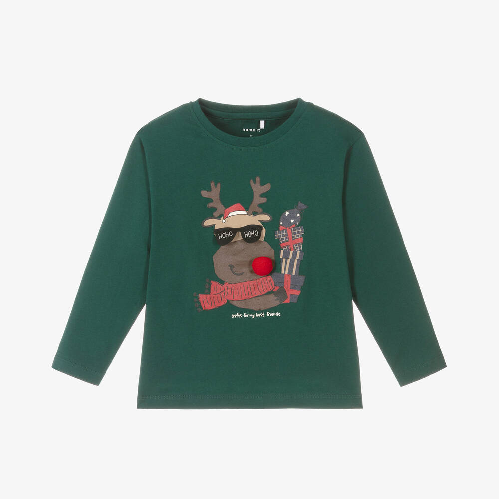 Fun and festive, a green organic cotton blend top for boys by NAME IT. Made in comfortable jersey, it has a lift-the-flap appliqué of a winking reindeer with a red pom-pom nose on the front.