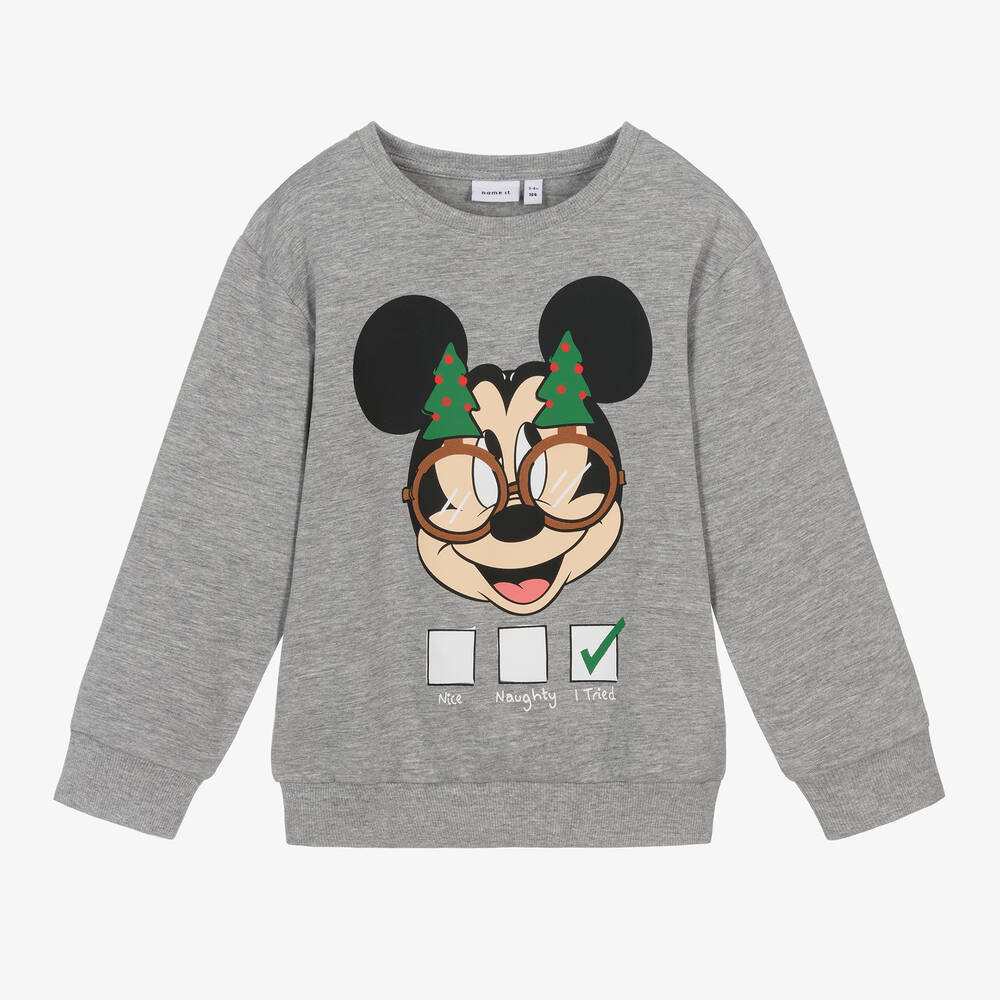 Grey marl top for boys by Danish brand NAME IT, made in soft and stretchy cotton jersey blend with gently ribbed trims. This crew neck top has a festive Mickey Mouse graphic on the front with funny tick boxes below. It has a fleecy feel on the inside for added comfort.