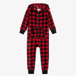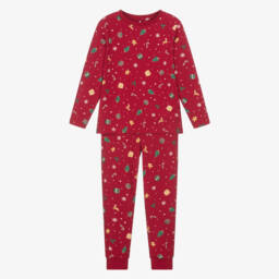 Red festive pyjamas for boys and girls by NAME IT, made in soft cotton jersey. Ideal for cosy nights, the top and bottoms feature a cheerful, all-over Christmas-themed print with presents, candy canes and Christmas trees. The ribbed cuffs and elasticated waist ensure a snug and comfortable fit.