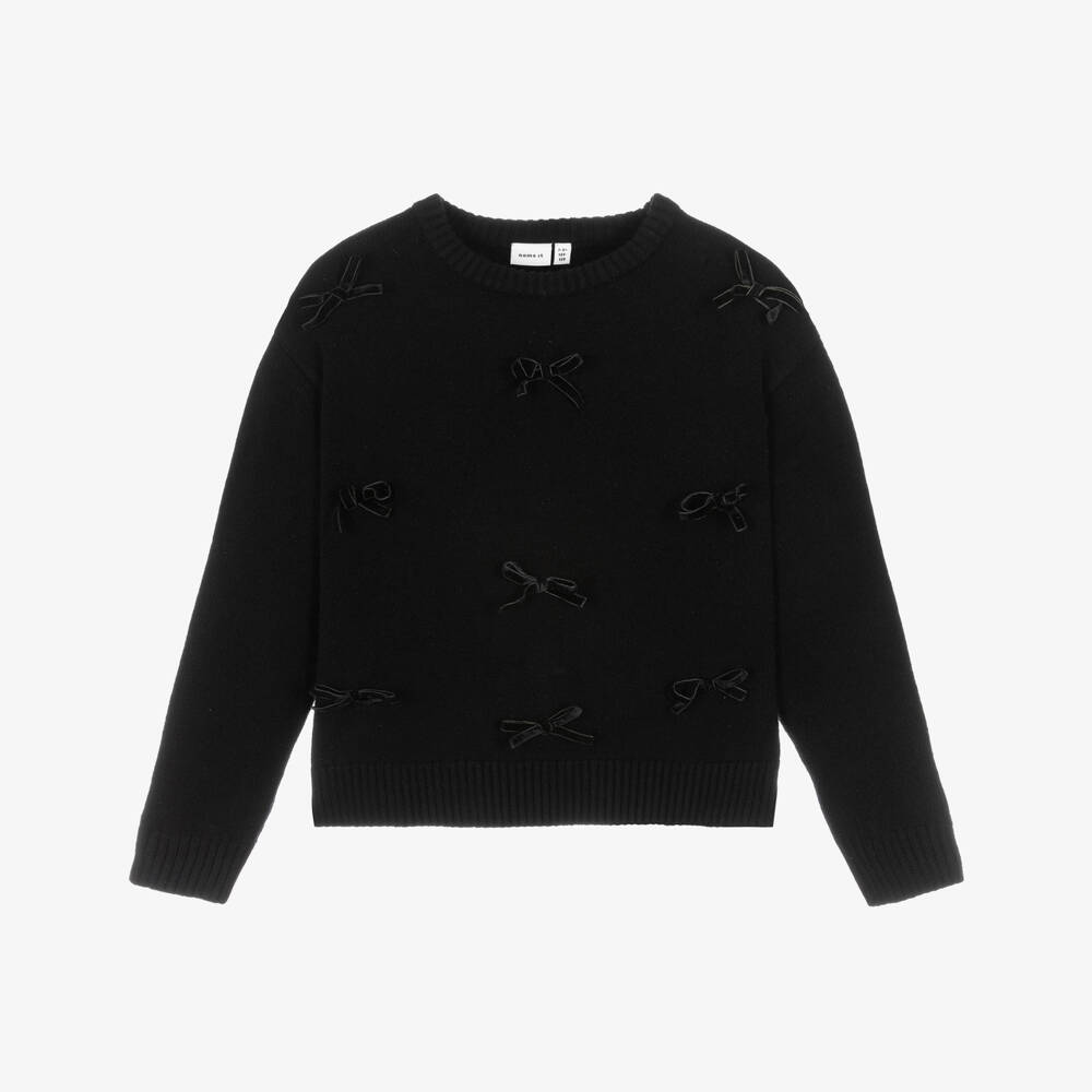 A stylish black long-sleeved jumper for girls by NAME IT. Warm and cosy, it is made from a soft viscose-blend knit with ribbed trims to enhance the effortlessly casual look. It is stitched with velvet ribbon bows on the front for a chic finish.