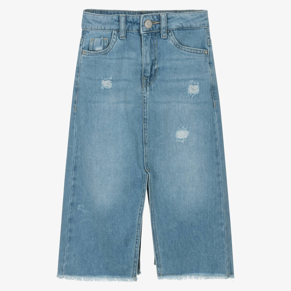 Light blue denim midi skirt for girls by NAME IT, made from soft cotton. Cool and casual, this classic five-pocket style has intentional distressed patches, a frayed hem and splits at the front and back. The skirt fastens with a zip and hook and has an adjustable waist for a great fit.