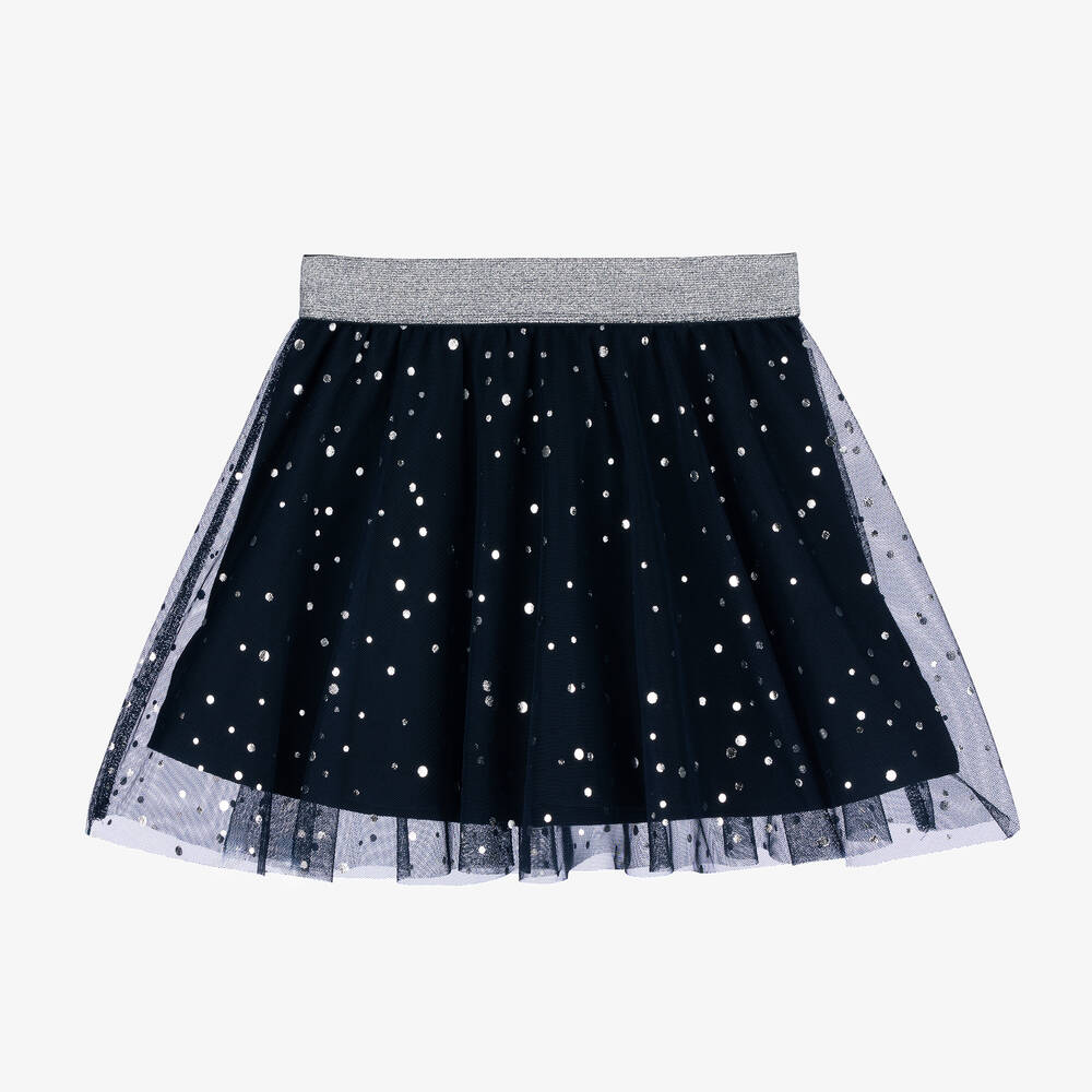 Navy blue tulle skirt for girls by Danish brand NAME IT, patterned with silver dots for a sparkly touch. Ideal for party and casual looks alike, this comfortable style has a stretchy silver glitter waistband and is lined in soft organic cotton jersey.