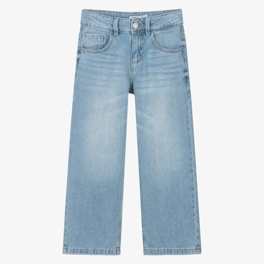 Light blue washed denim jeans for girls by NAME IT, made with organic cotton. Designed in a stylish wide leg silhouette, these comfortable jeans have soft beige contrast stitch detailing and five useful pockets. They have an adjustable waistband for an ideal fit and fasten with a hook and zip.