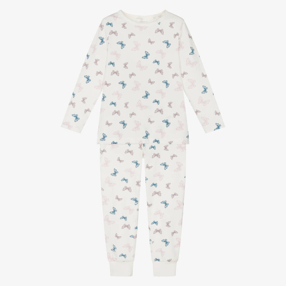 Ivory pyjamas for girls by NAME IT, made in soft cotton jersey with a blue and pink butterfly print. The top has long sleeves and a round neck. The matching bottoms have gently ribbed ankles and an elasticated waist for a comfortable night's sleep.