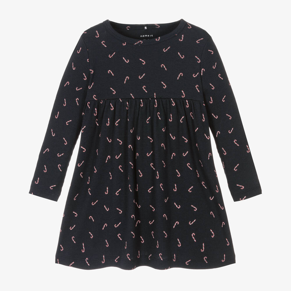 Festive navy blue dress for girls by Danish brand NAME IT, made with organic cotton. Ideal for Christmas, it is patterned with red and white striped candy canes. Easy to wear, this long-sleeved style is made in comfortable, ribbed jersey with a full, gathered skirt.